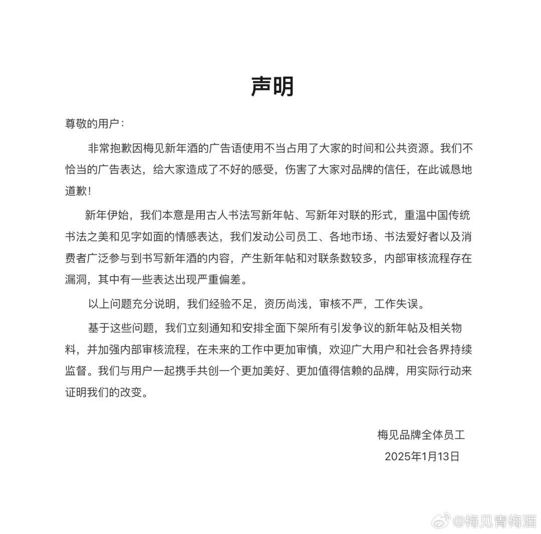 聲明中,梅見酒解釋稱,他們本意是想以古人書法的形式重溫中國的傳統(tǒng)文化,但由于內(nèi)部審核流程的漏洞,導(dǎo)致了一些表達(dá)嚴(yán)重偏差,從而造成了公眾的不適和對(duì)品牌信任的傷害。