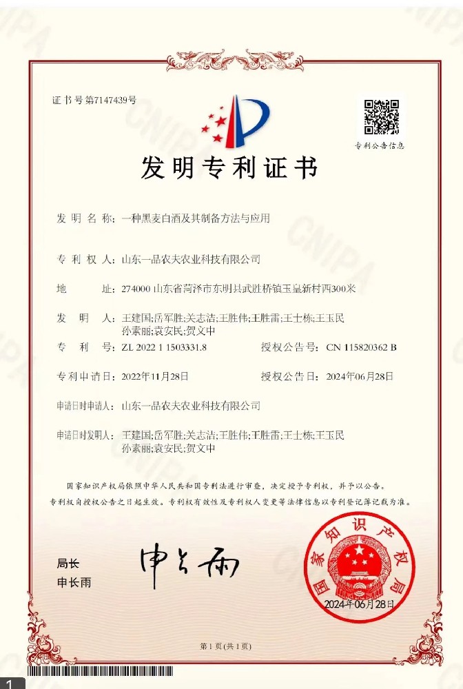 近日,山東一品農(nóng)夫農(nóng)業(yè)科技有限公司“一種黑麥白酒及其制備方法與應用”發(fā)明專利獲批(專利號:ZL 2022 1 1503331.8),該公司也成為白酒行業(yè)首家以黑···